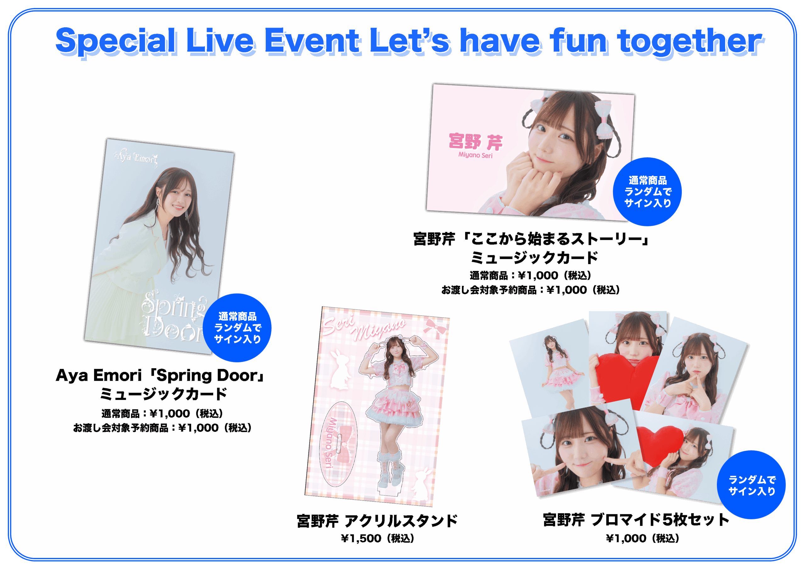 ※各商品1会計5枚まで購入可能です。「宮野芹 アクリルスタンド」のみ1会計3枚までとなります。